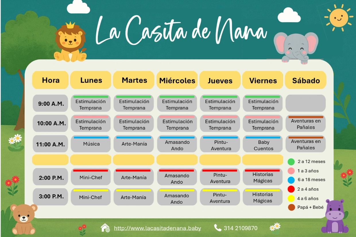 En La Casita de Nana cada día es una nueva aventura de aprendizaje, juego, creatividad y cariño. Hemos diseñado un horario especial con actividades pensadas para el desarrollo integral de los más pequeños, desde bebés hasta niños de 6 años.